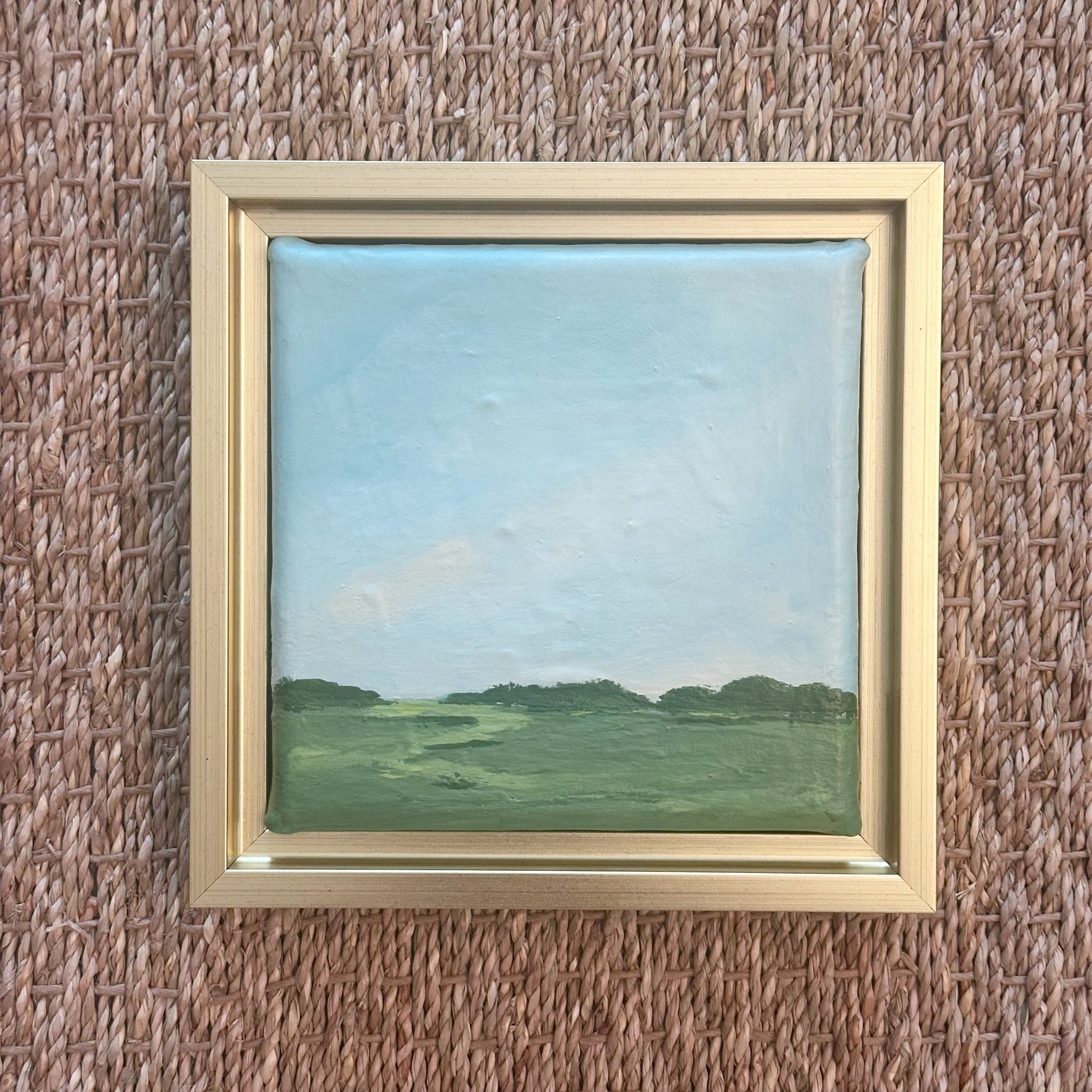 Original acrylic abstract landscape on 6 x 6 inch canvas framed in 1.25 inch thick gold floater frame.
