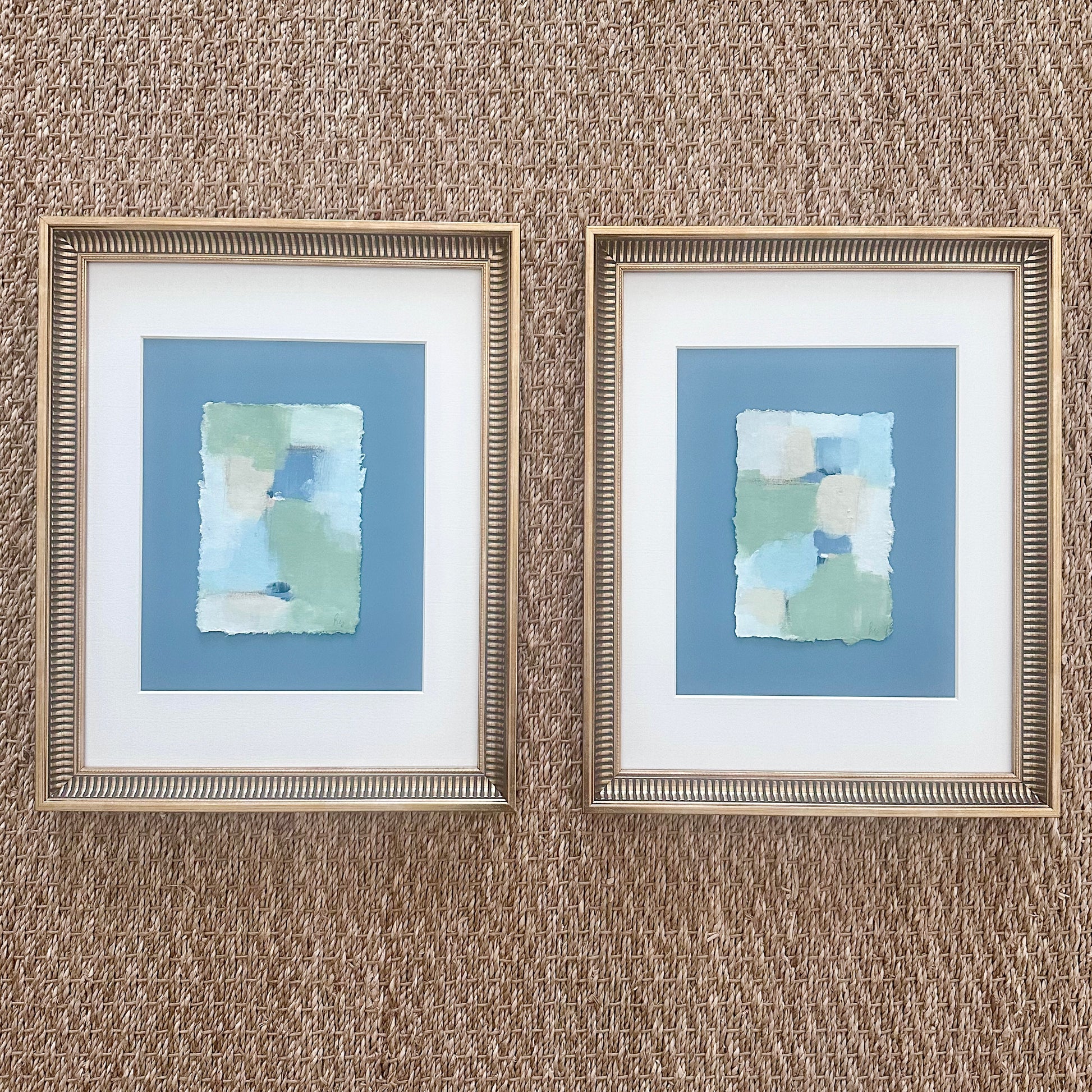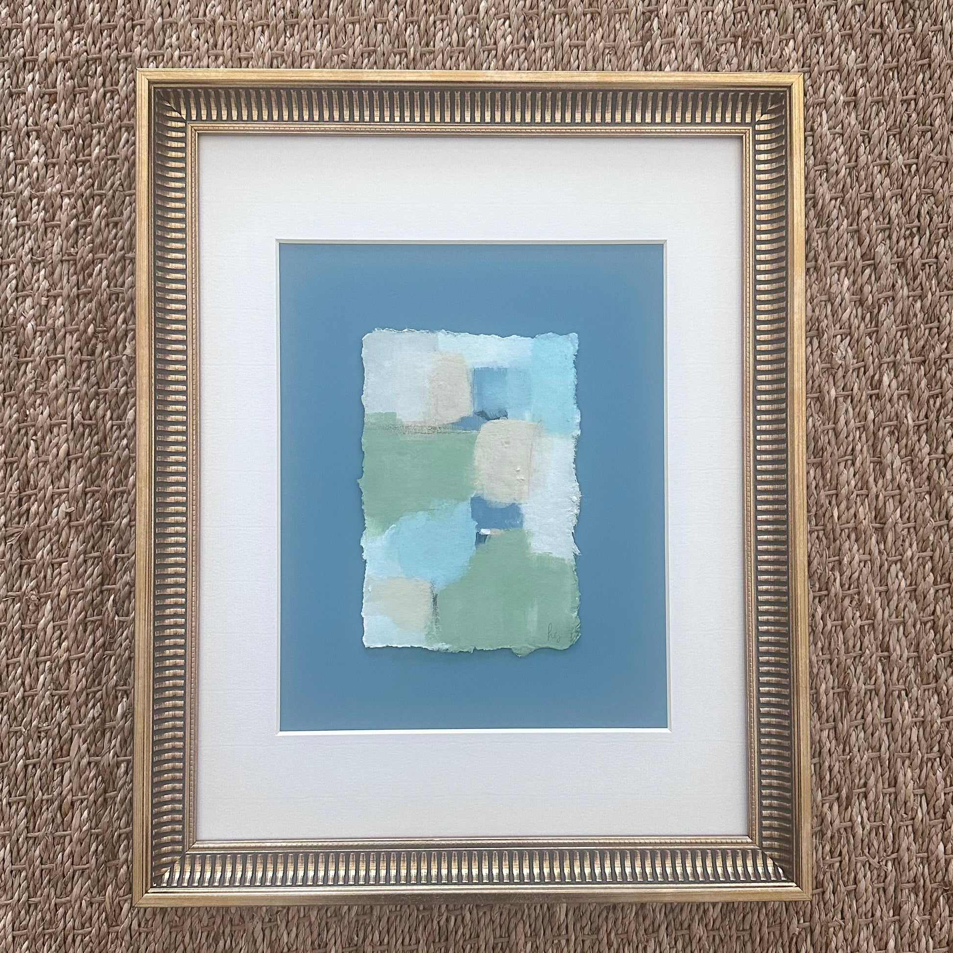 Original abstract on 4 x 6 inch deckled edge paper float mounted on blue mat and an off-white 8 x 10 inch outer mat