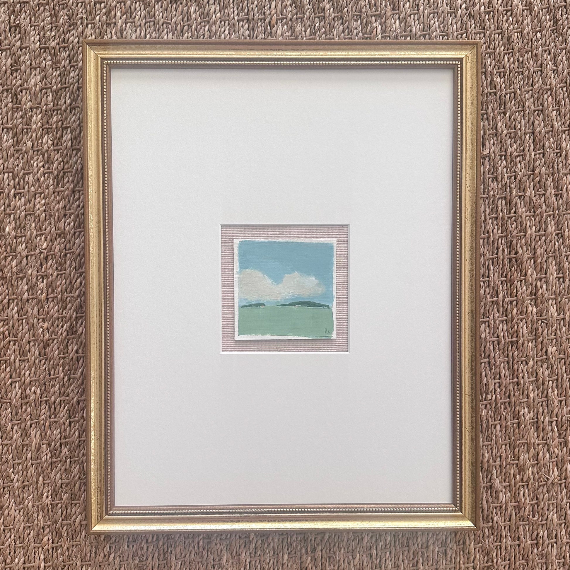 Original landscape abstract in acrylic and pencil on textured linen paper float mounted on grass cloth matted and framed in brushed gold frame.
