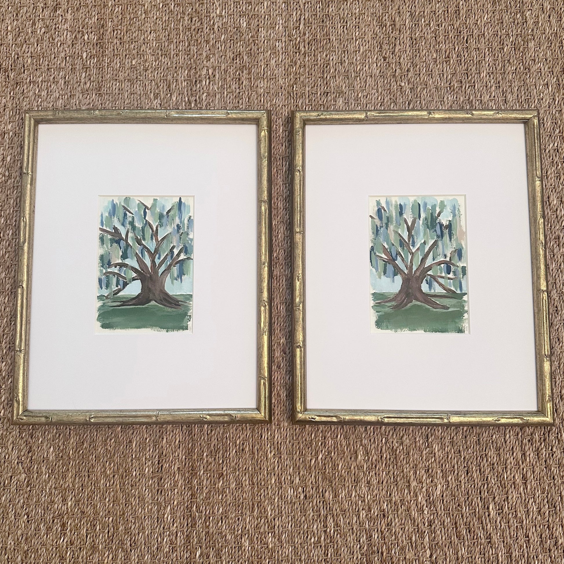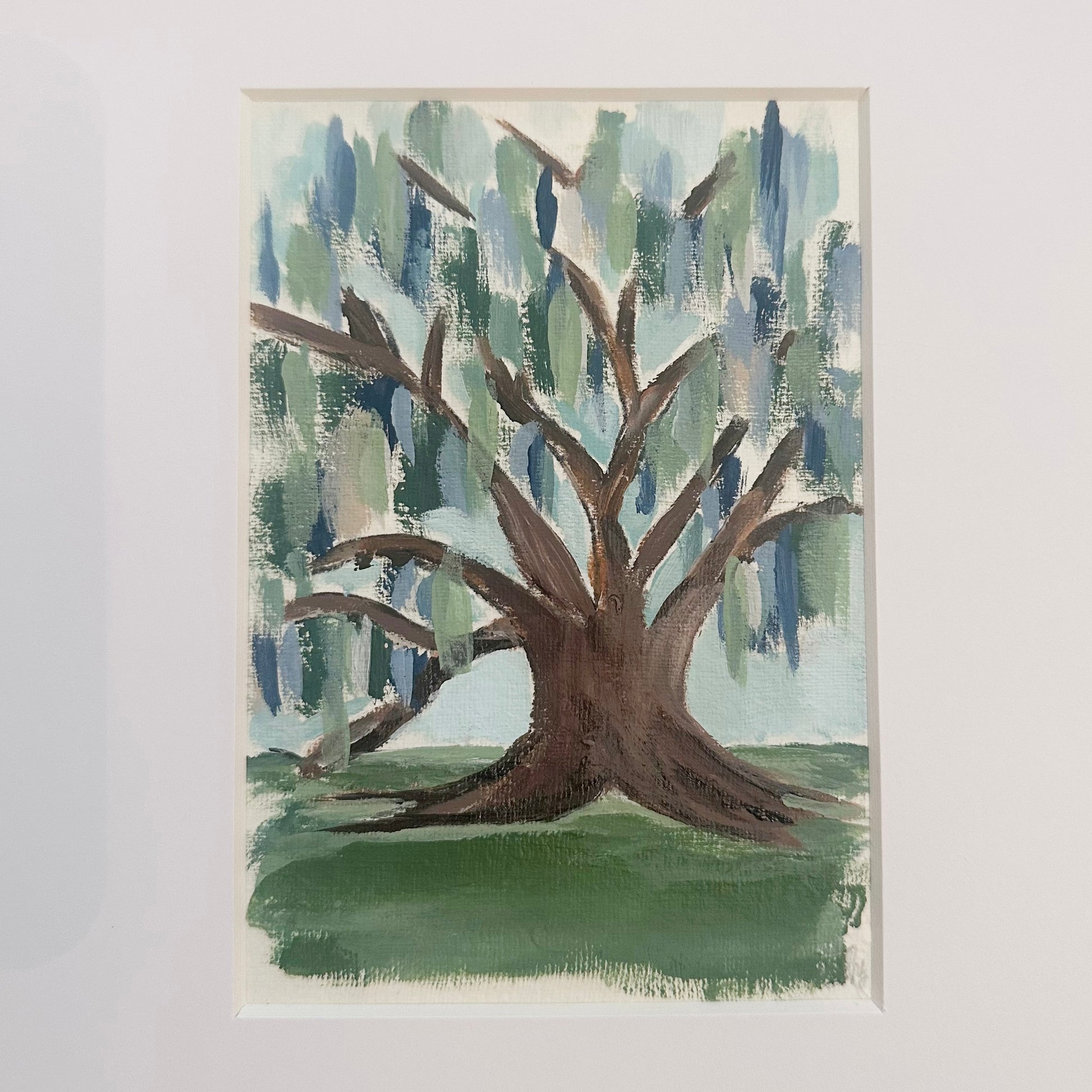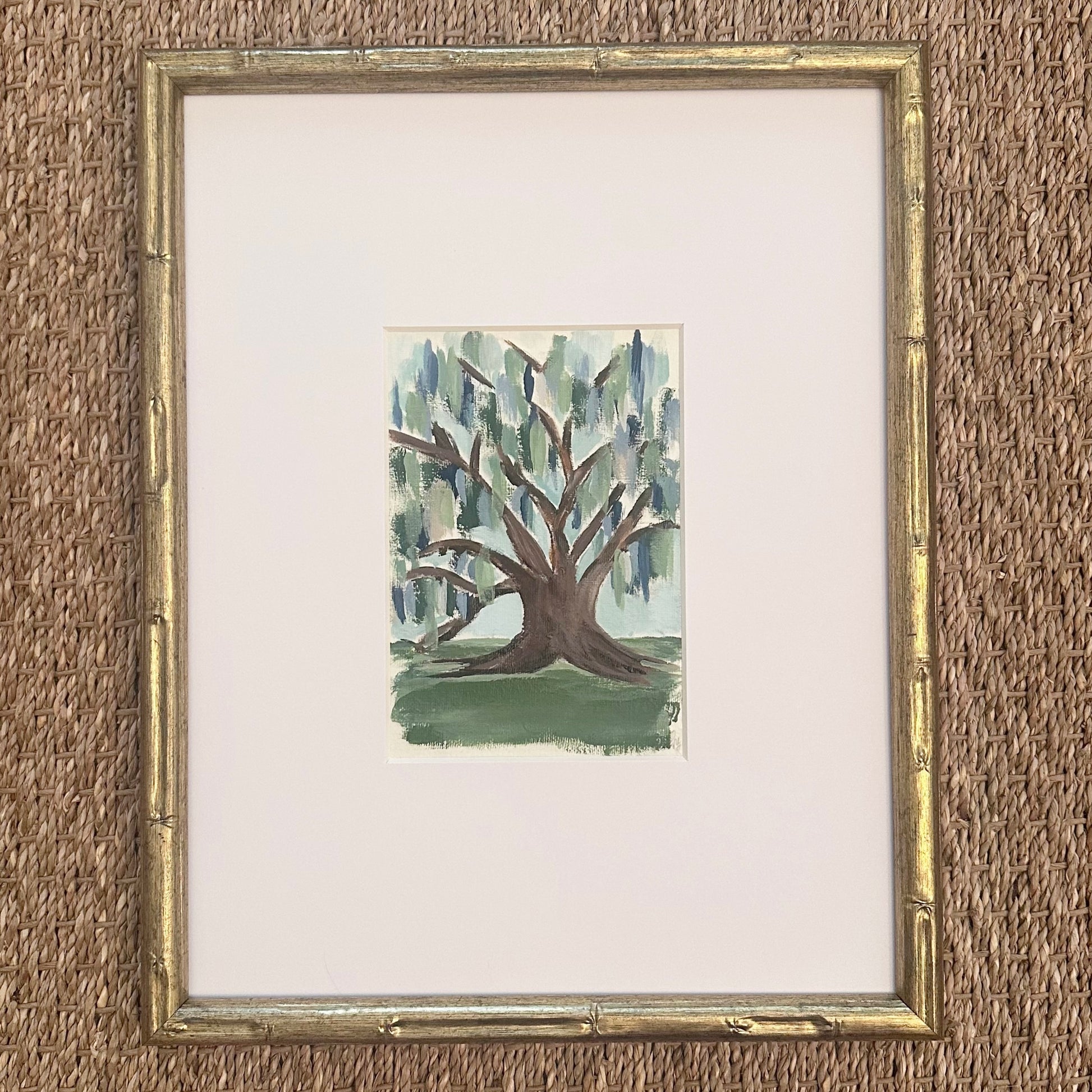 Original abstract live oak tree on 5 x 7 inch heavy textured paper matted and framed in 12 x 15 inch antiqued gold bamboo frame