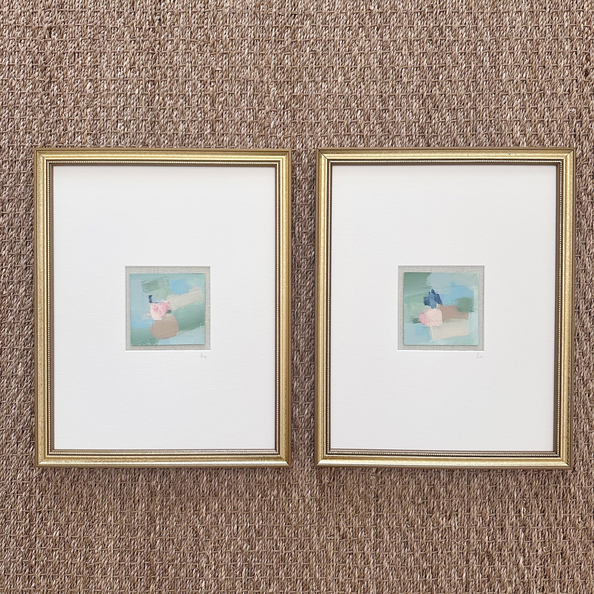 Original 3.5 x 3.5 inch abstract in acrylic and pencil on textured linen paper float mounted on celadon colored grass cloth matted to 4 x 4 inches