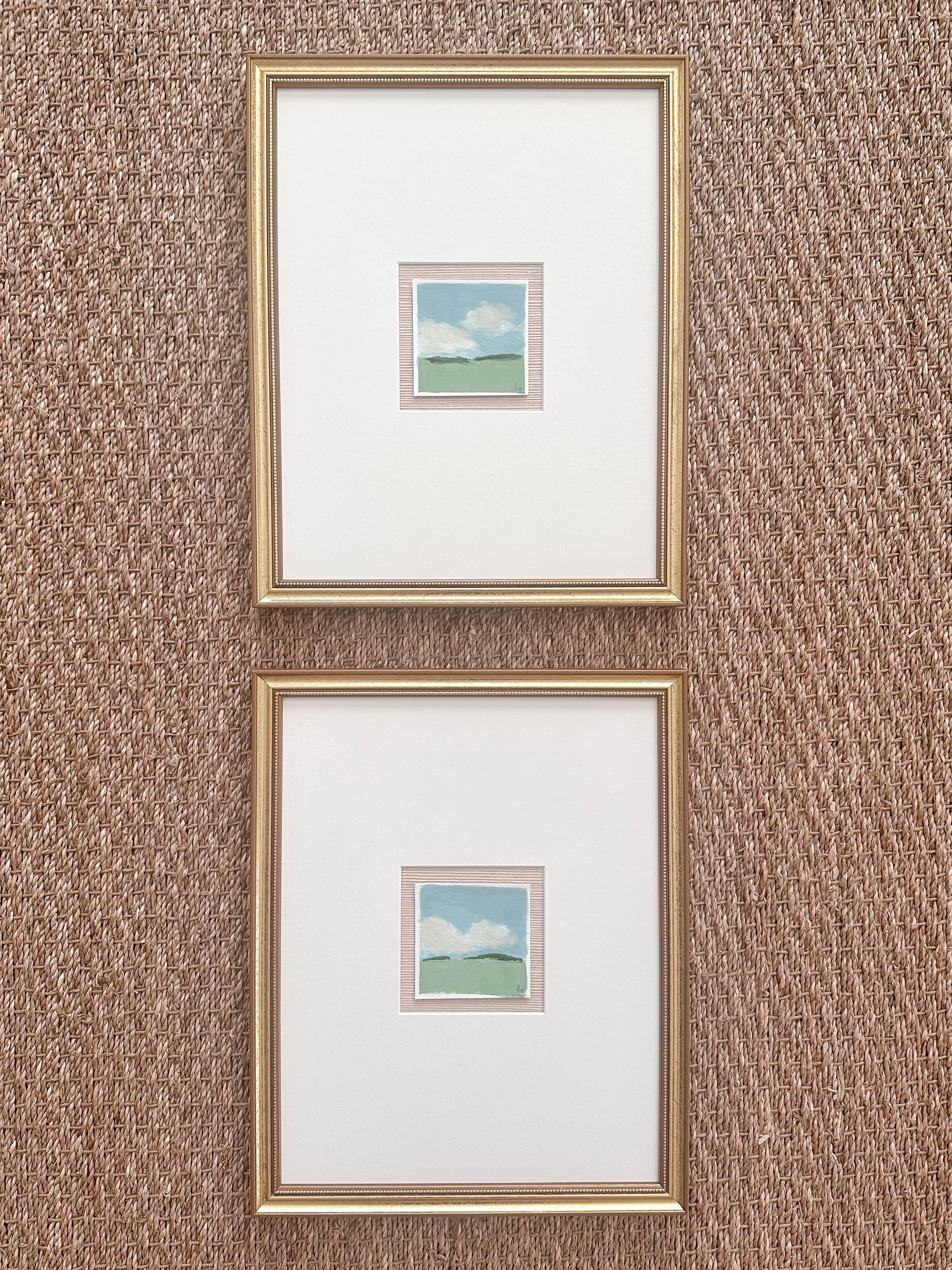 Original landscape abstract in acrylic and pencil on textured linen paper float mounted on grass cloth matted and framed in brushed gold frame.