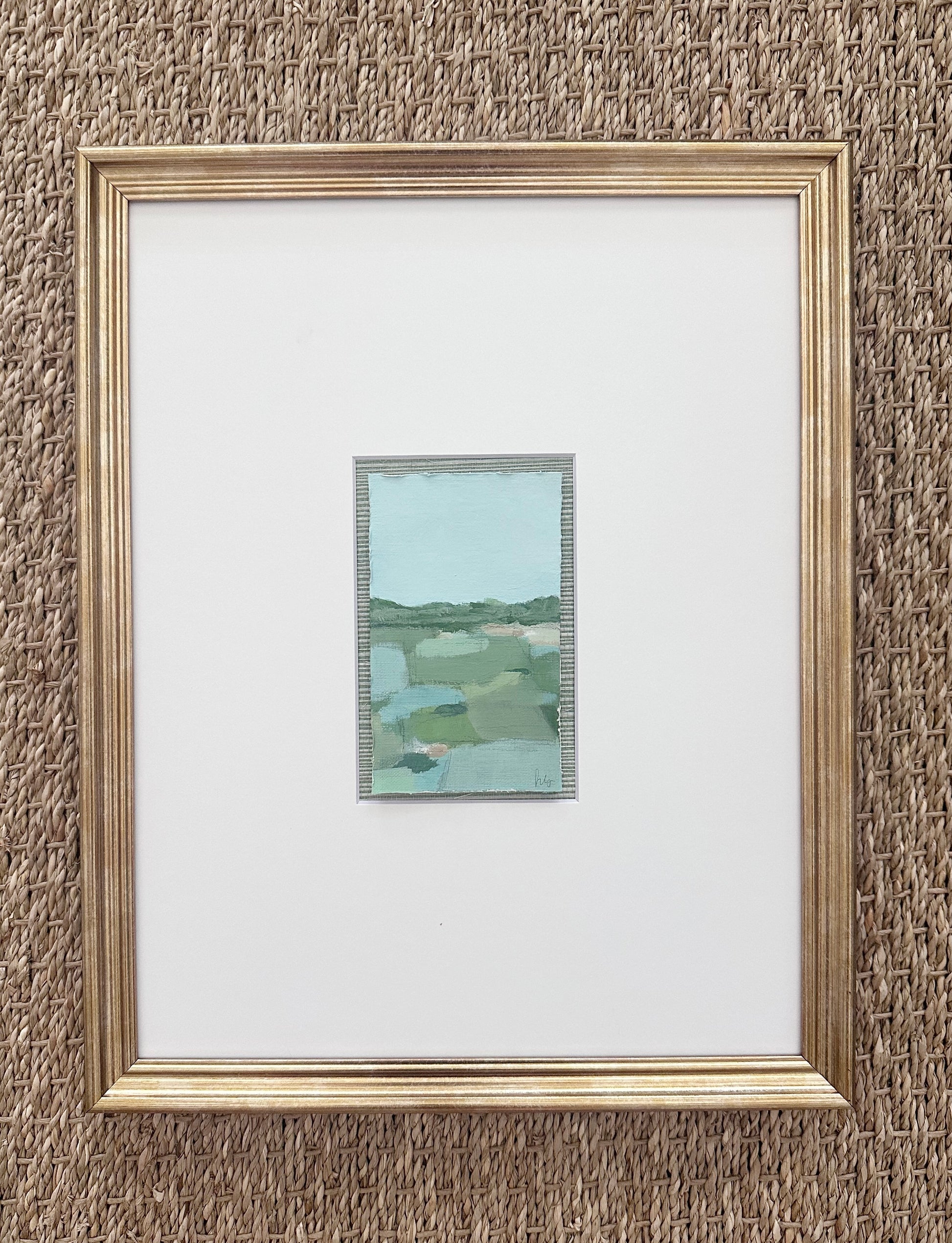 Original landscape abstract done in acrylic and pencil on textured linen paper float mounted on grass cloth matted in a gold frame